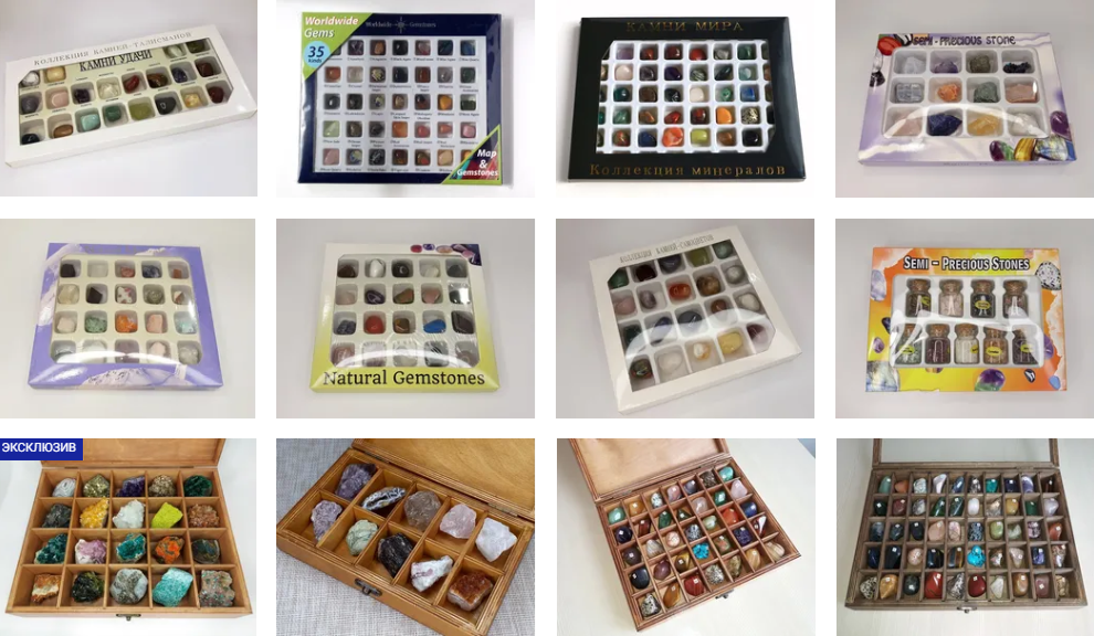 Коллекции камней в картонных и деревянных коробках